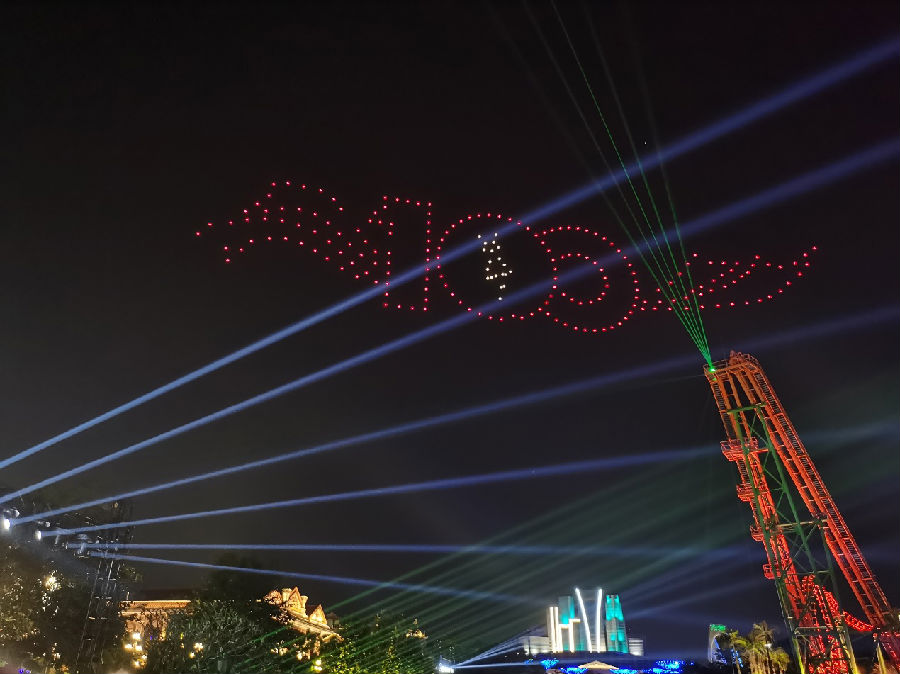 南寧方特東盟神畫舉辦了以“慶祝建黨100周年”為主題的無人機星空表演,讓游客大飽眼福。隨著音樂節奏不斷變化,無人機在星空描繪組合出“100周年”“小紅軍吹號角”等創意圖案。與此同時,絢麗的花船搭配真人歌舞表演,在湖面上緩緩前行,璀璨的燈光點亮夜空,與無人機表演相映成輝,令現場游客發出陣陣歡呼聲、贊嘆聲,抒發對黨和祖國的誠摯熱愛。