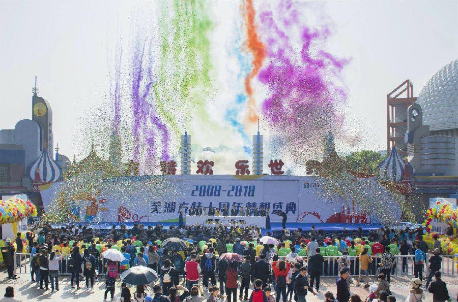 10年,蕪湖方特接待了來自世界各地超過4300萬游客,售出的玩偶公仔堆起來高度超過30座珠穆朗瑪峰,深受大家喜愛的夜場節(jié)目“夢幻大巡游”已累計(jì)走過540公里,節(jié)目中與游客互動(dòng)擊掌近45000次;10年,蕪湖方特過山車?yán)塾?jì)極速飛馳19.86萬公里,可環(huán)繞地球近5圈。