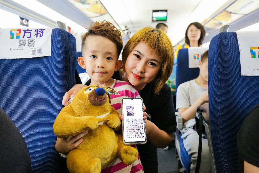 當搭乘本次列車的旅客們走進車廂,他們驚喜地發現車廂內隨處可見方特元素——座椅枕巾、創意海報、車窗透明貼、行李架彩貼乃至列車廣播等細節,都經過全新設計,體現出無處不在的方特魅力,旅客們借此更加直觀地感受到華強方特的歡樂理念。