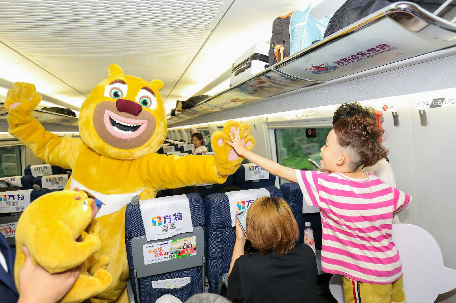 不僅如此,方特原創動漫IP“熊出沒”人偶還現身車廂,它們不時向旅客派發小禮物,展現萌趣可愛的造型與動作,吸引眾多旅客拍照合影和積極互動,并刷屏社交媒體。有旅客表示:“這條(高鐵)線路上有好幾座方特主題樂園,現在孩子剛好在放暑假,有機會的話一定會帶著孩子就近到方特主題樂園體驗?!?/p>